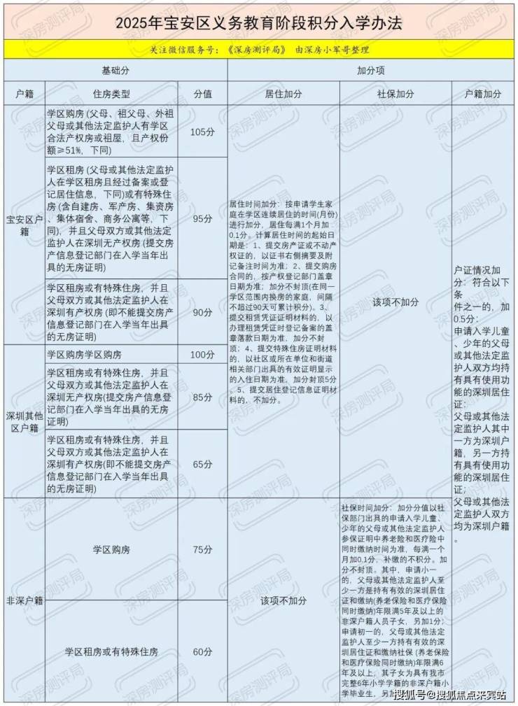 积分构成:基础分(宝安户籍 + 学区购房,产权份额≥51%)105 分 + 户籍固定加分 0.5 分 + 居住时间加分(每满 1 个月 + 0.1 分,需网格登记确认),最高基础分 105.5 分;