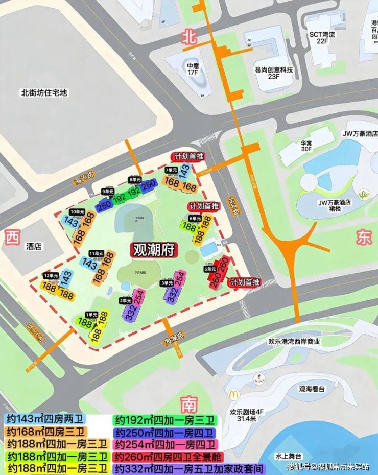 《华润招商观潮府》位于深圳市宝安区新安街道宝安中心区,观潮府也就是宝中A002-0108宗地,俗称南街坊地块,是在2025版《住宅项目规范》新国标发布后,于2025年8月15日深圳集中土拍供地,由华润+招商以86.4亿元竞得,为2025年深圳地王,溢价率34.8%,楼面价59586元/㎡,将会按照新国标住宅来打造,是深圳备受关注的豪宅项目。容积率低至3.41,总高只有23-26层。项目预计2026年3月底取证入市,计划首推的是3/5/6/7单元,有143-168-188-245-260-330-488㎡户型,户户带有专梯入户。预计2028年一季度带高品质精装交付,位置属于限购区,购房需一年深圳社保或者深户资格。