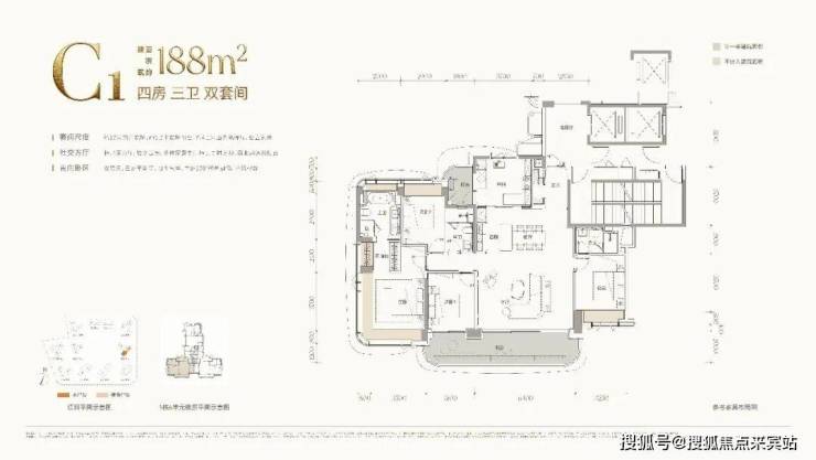 C2户型:建面约188㎡四房三卫双套间,西南朝向,和C1户型类似,在阳台朝向和入户门位置有所区别。
