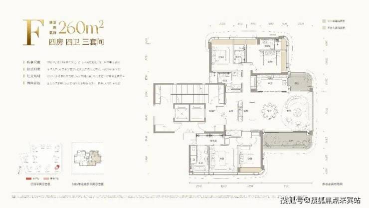 F户型:建面约:260㎡(四房四卫双阳台全景舱),主阳台开间约:7.2米,客餐厅开间约:5.7米,客餐厅厨房+阳台面积将近约:100㎡,预估套内约:218.1㎡(不计飘窗,阳台计一半),得房率约:83.88%,预估赠送面积约:40.94㎡,加上赠送套内约:259.04㎡,预估实际实用率约:98.39%,2梯2户专梯入户高端私密,260㎡四房四卫(三套房双阳台),加上赠送实用率接近约99%,户型非常实用,客厅全景舱设计,东南朝向通透格局,景观视野都达到最佳,海景、园景、摩天轮、城市夜景尽收眼底。