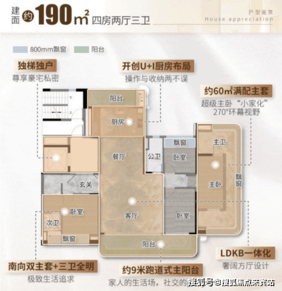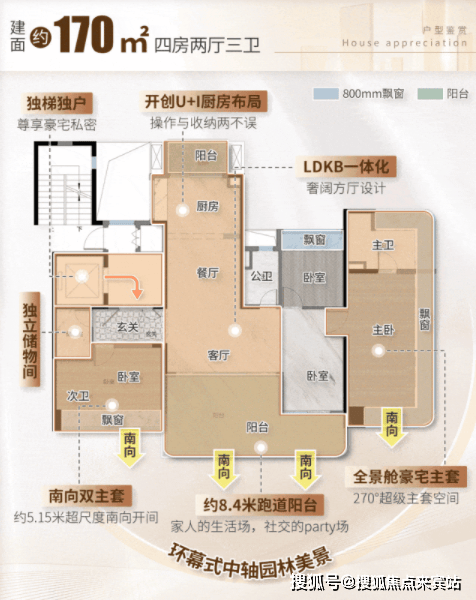 170-190㎡:双主套、双阳台、270° 环幕视野,单边位设计。