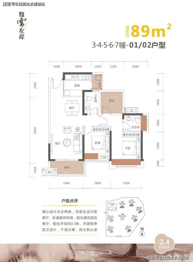 89㎡3房2厅2卫,双阳台,有一个生活小阳台,赠送的小阳台可做儿童房,89平米做小三房且两个卧室朝南还是非常不错的。客厅3.5米,两个卫生间舒适性三房。