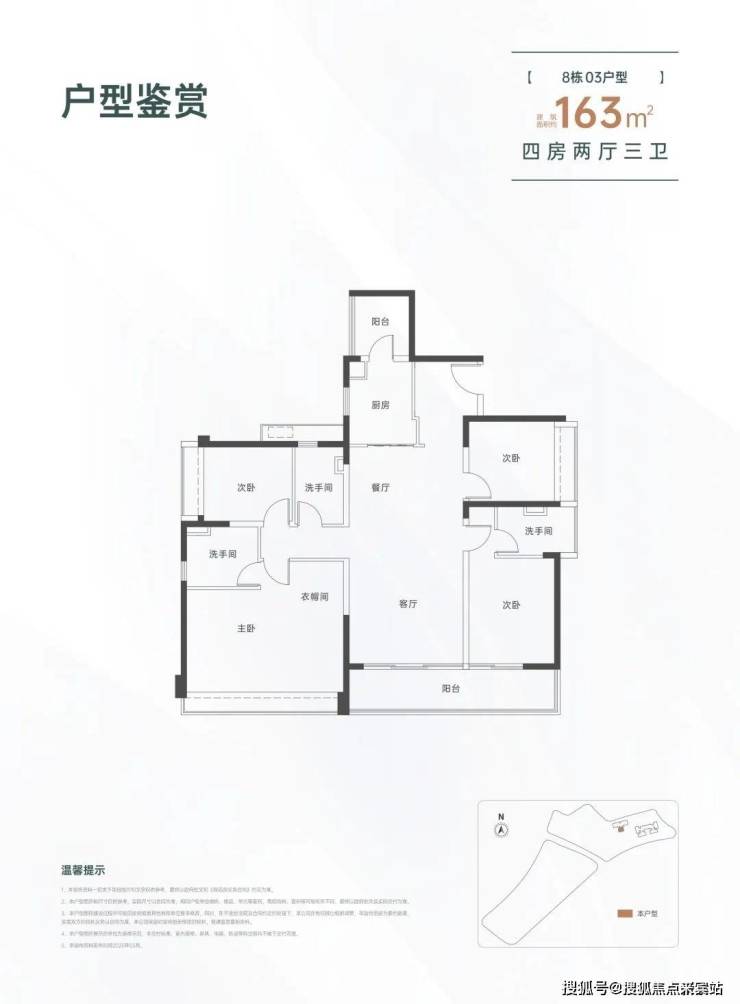 163㎡的4房2厅3卫,设计的是竖厅格局,一梯一户,进门入户玄关,LDKB一体化设计,三开间朝南,双主卧套房,客厅连接次卧出大阳台,L型厨房还带1个生活阳台,卫生间干湿分离,得房率约82%(不含赠送),东南朝向。