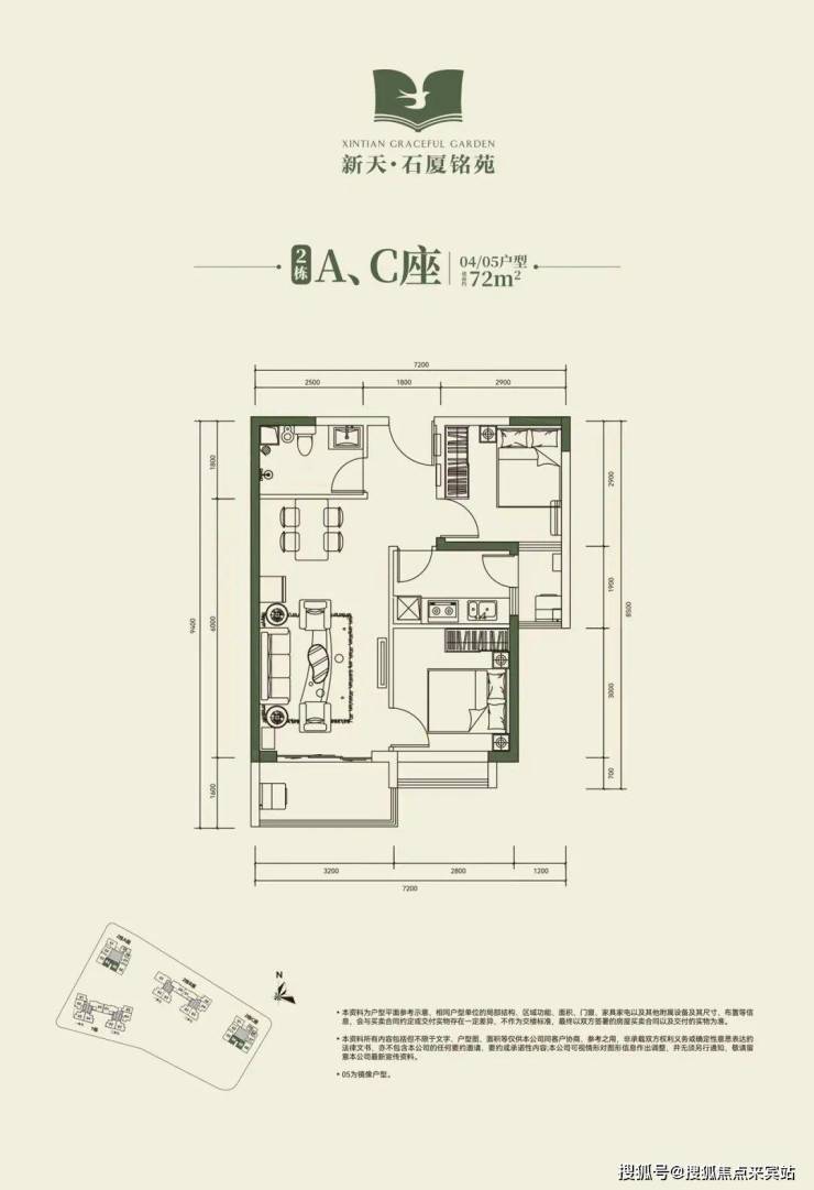 2栋B座二单元04、05户型:面积约为72-74㎡的2房2厅1卫。