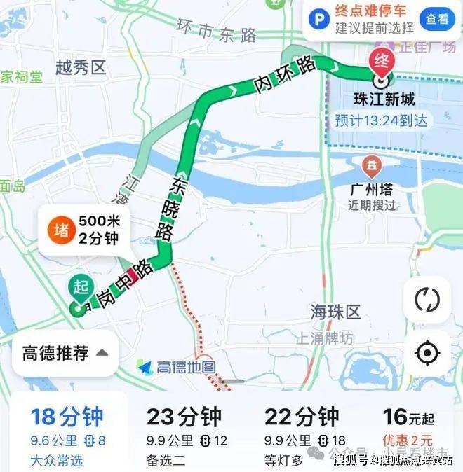 自驾去珠城:走昌岗中路转到东晓路,再转内环路至黄埔大道西,全程9.6公里,耗时18分钟左右。
