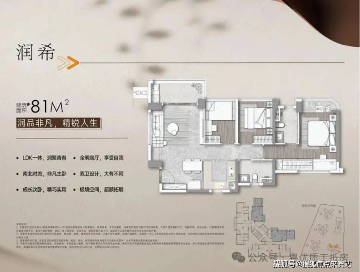 81㎡三房双卫:主卧270°飘窗白送1.5㎡,次卧可变书房/儿童活动区;