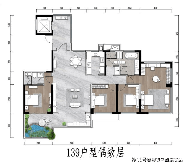 139㎡户型实现所有房间朝南的南向五开间格局;双套房设计,主卧套实现南北通带独立衣帽间,主卫五件套布局。