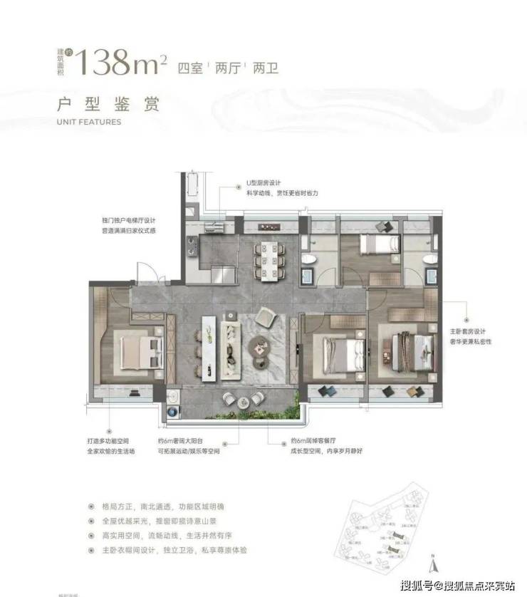 入户玄关巧妙隔绝视线,隐私感拉满。客餐厅南北通透,大客厅除传统布局外,还增设茶台区域,两者共享 6 米多宽景阳台,搭配 U 型厨房与方正餐厅,公区气场全开。