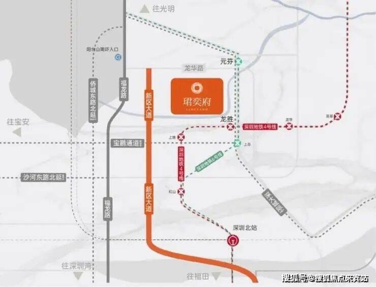 • 3轨道:地铁:约500米4号线龙胜站,约800米6号线元芬站,3站深圳北, 5站福田;城际铁路:深大城际(在建中),3站到机场。• 1大道:新区大道,7个红绿灯到福田。• 4干道:福龙路快速路,畅达福田中心;侨城东路北延(在建中)、沙河东路北延(规划中)、宝鹏通道(规划中)畅达南山、宝安,节省约20%通勤效率。