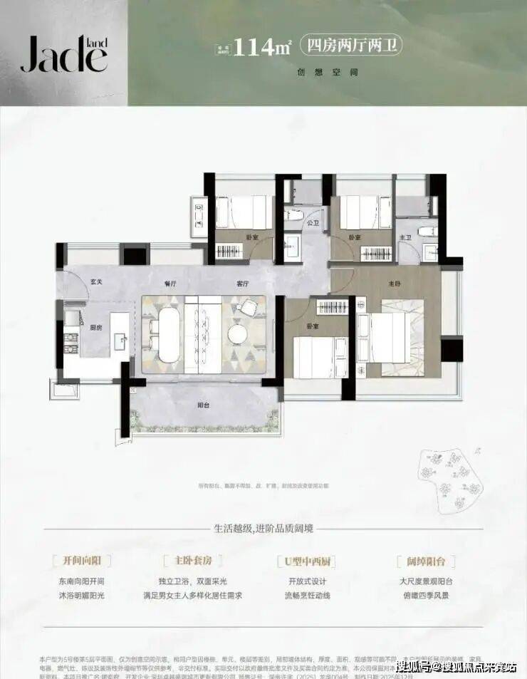 114㎡四房两卫:横厅设计+南北通透,三代同堂舒适之选。