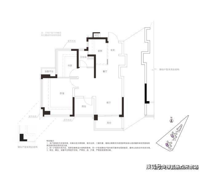 竖厅动静分区,S型墙内嵌冰箱位,“阳台”和“书房”处实际可以做房间。