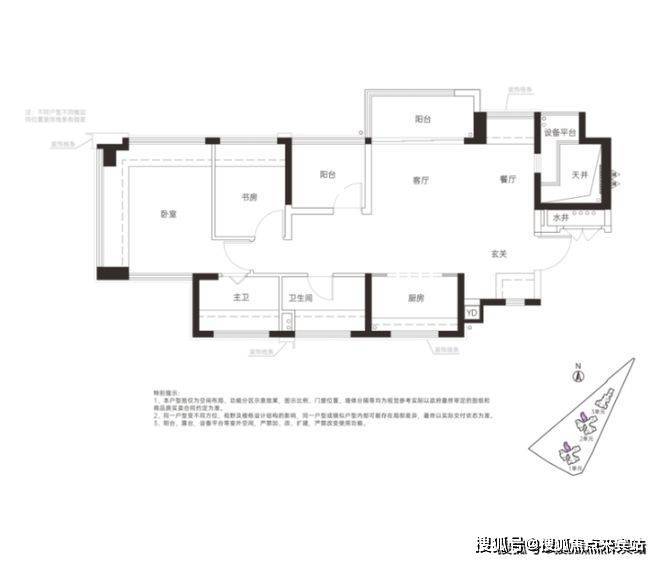 横厅设计,入户玄关处可以做收纳,全屋多飘窗,主卧套房设计,“阳台”和“书房”处实际可以做房间。