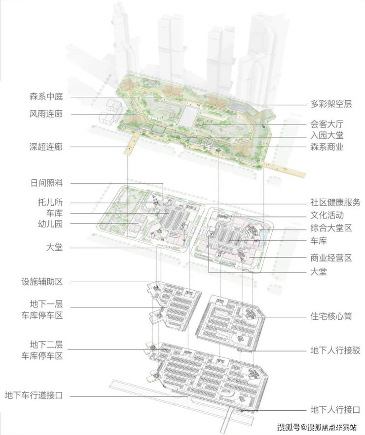 在垂直维度打造了一套过度城市与住区的 “城市甲板” 系统:将城市商业,社区配套服务,文化活动等置于底层,以模糊的边界与公共的功能布局与城市相连。