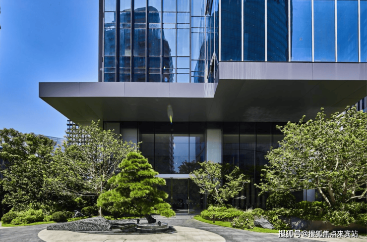 大堂入口处,自日本引进的百年黑松与镜面水景造型相呼应,寓意事业蒸蒸日上、松鹤延年,亦最大程度将仪式感拉满。