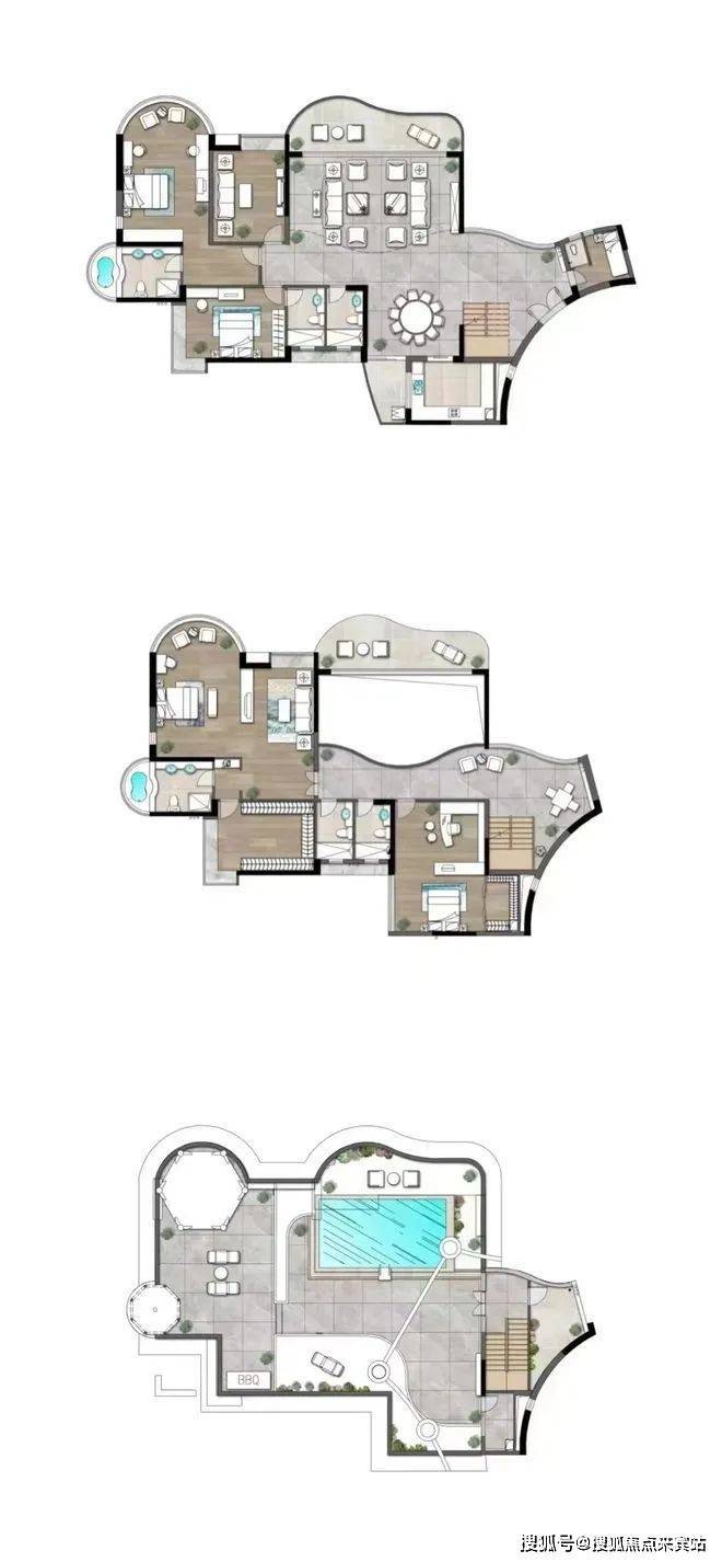 再细看,约458平、467平、564平顶复户型图参考如下,为双层结构,且赠送多一层露天泳池花园,相当于有3层使用空间。