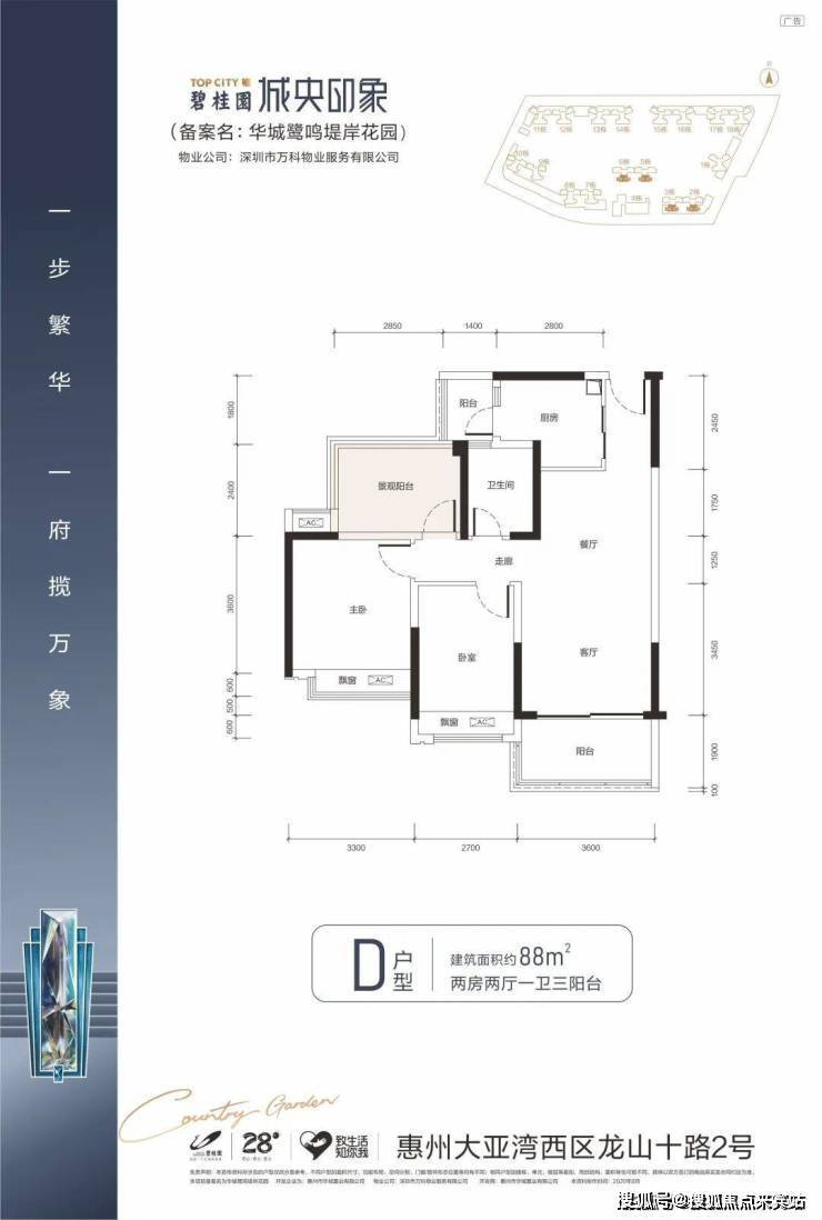 碧桂园·城央印象临近沿海高速、深汕高速和惠大高速,距离澳头高速收费站约1.5公里路程,毗邻龙山十路,紧邻大亚湾大道、龙海二路、石化大道。碧桂园·城央印象,占地约7.6万平米,总建面约33万平米,绿化率30%,容积率为3.2,项目主力户型建筑面积为90㎡-110㎡。