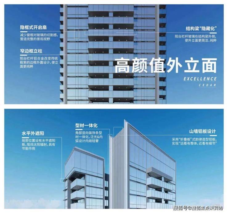 以写字楼和高级住宅美学工艺,锻造铝板幕墙+LOW-E玻璃外立面,超纤细边框设计,展现极简前沿风格。