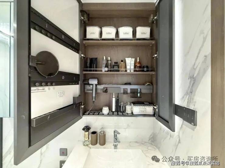 卫浴方面用了汉斯格雅、唯宝和杜拉维特,品牌定位也是相当凑合。另外主卫还配备了美妆冰箱,牙刷除菌的收纳柜。