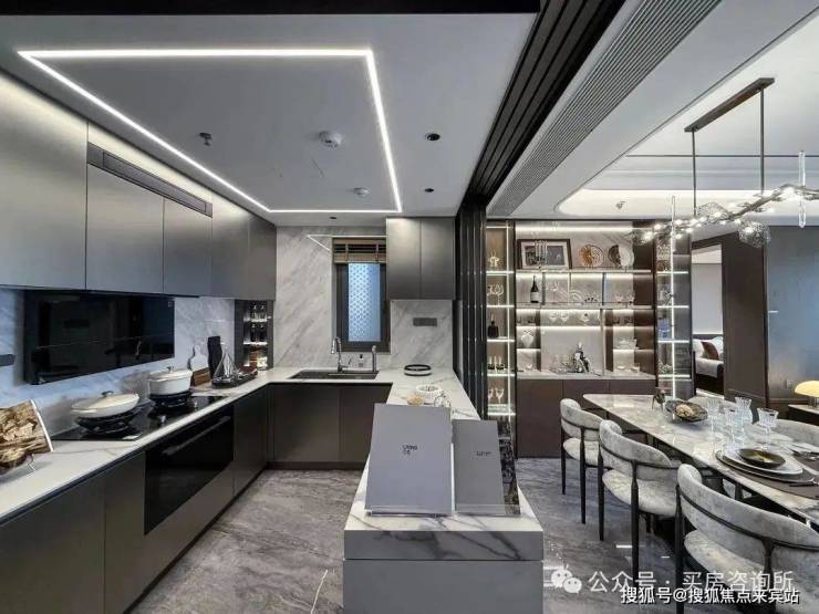 室内方面,进门的餐厨用了「深湾玖序」祖传同款的互动式可移动岛台,这种设计近年都比较火,平时亲友聚餐、做点心、包饺子等等的场景都可以贴合。