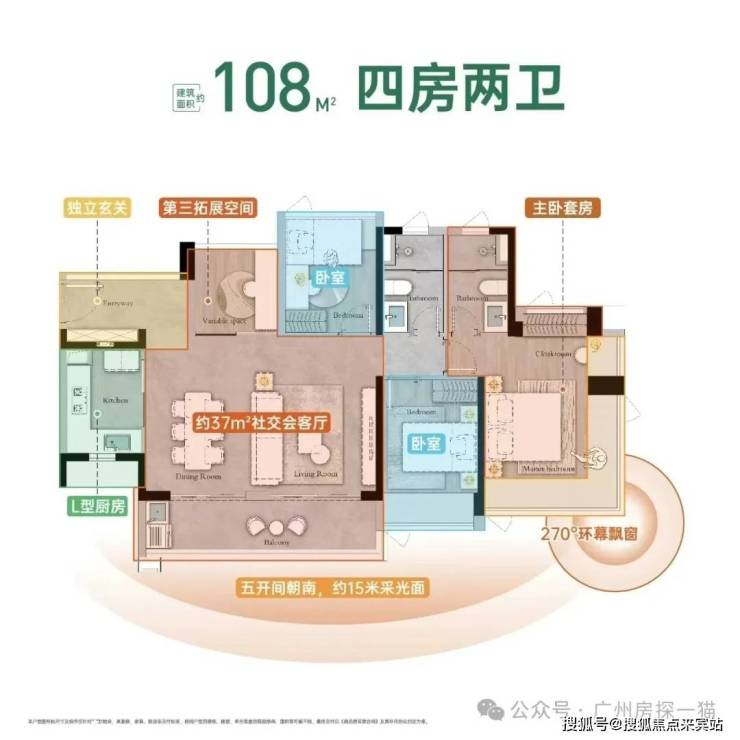 建面108平户型,是项目最大的户型,五开间朝南,客厅开间6.3米,整个南向采光面去到了12.9米,如果不需要那么多房间的话,还可以考虑保留北向的阳台,让南北对流更加通透