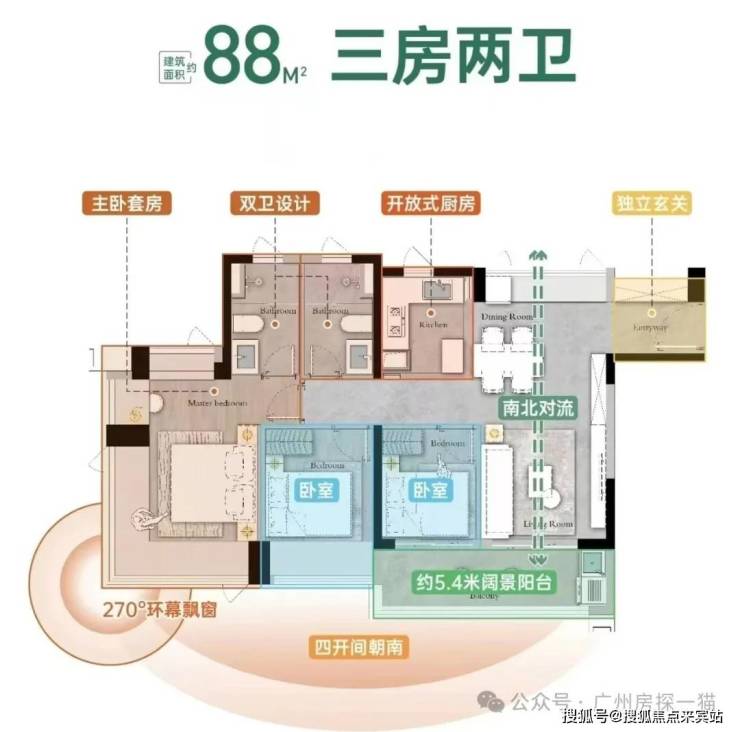 建面88平A2户型,三房两卫,三个卧室加阳台都是南向