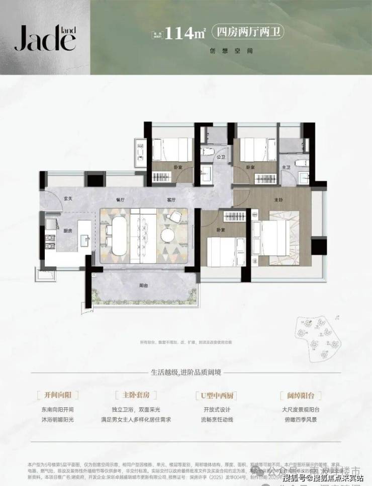 114平㎡的4房2厅2卫,设计的是横厅南北通透格局,进门入户玄关,LDKB一体化,五开间朝南,全屋9面飘窗,主卧大套间,U型厨房,卫生间干湿式分离,得房率约93.18%(包含赠送),阳台主朝东南向。