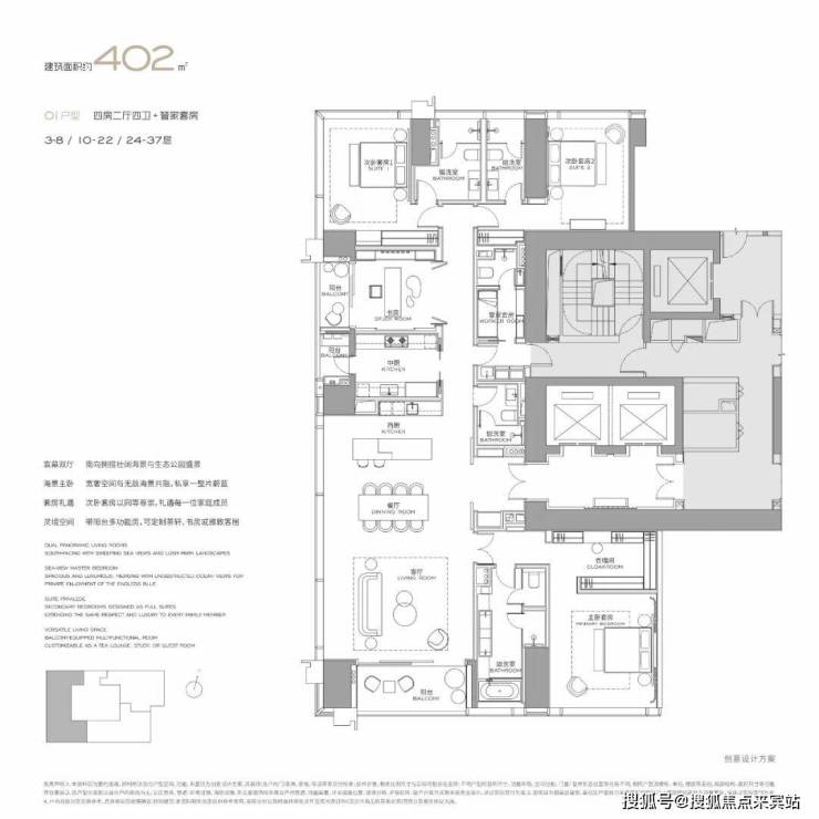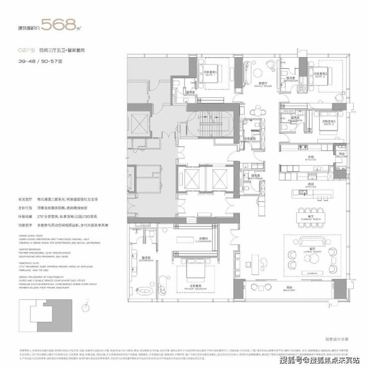 南北通透三面采光,顶奢总统套房规格,270°全景套房,享受湿地/公园/CBD景观,都是套房设计,更具私密性,中西厨分离。