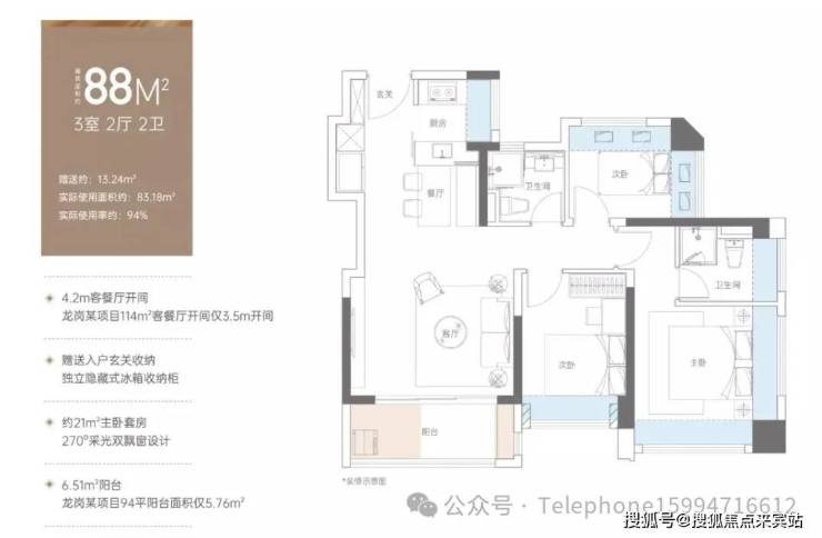 88㎡三房两厅两卫:同样采用LDKB一体设计,空间通透、动线高效,客厅开间约4.2米,堪比市面上100多㎡的户型,每个房间都有飘窗,主卧采用双飘窗设计。