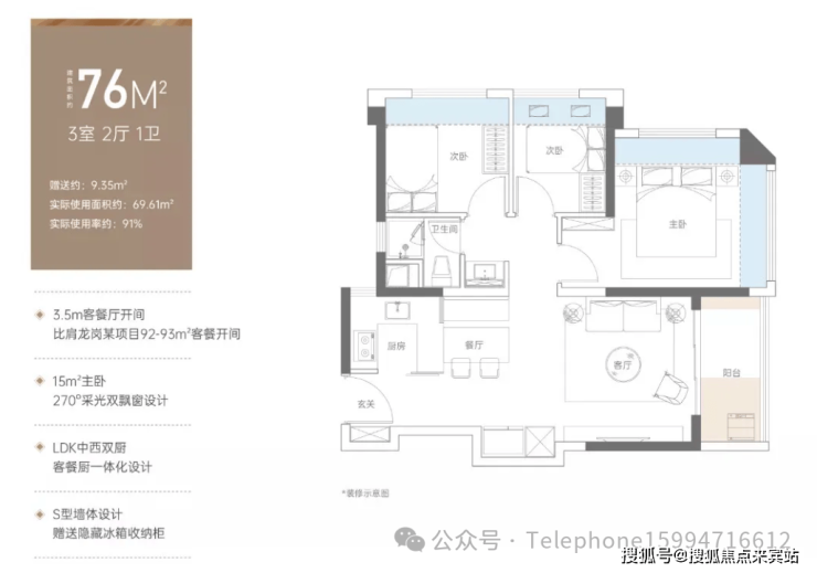 76㎡三房两厅一卫:主空间采用LDKB一体设计,空间通透宽敞,玄关处预留有嵌入式玄关柜和冰箱的位置,每个房间都有飘窗,卫生间干湿分离。