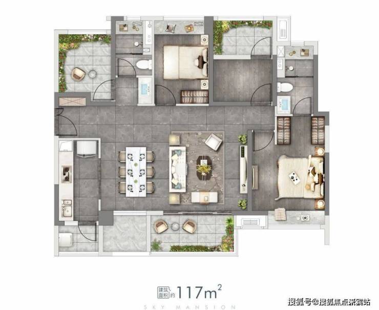建面约117平的户型,不仅做到了3+1房空间设计,每个功能空间也保持了舒展的尺度。