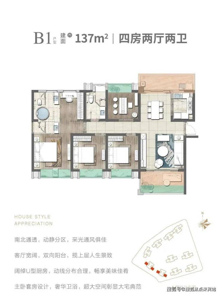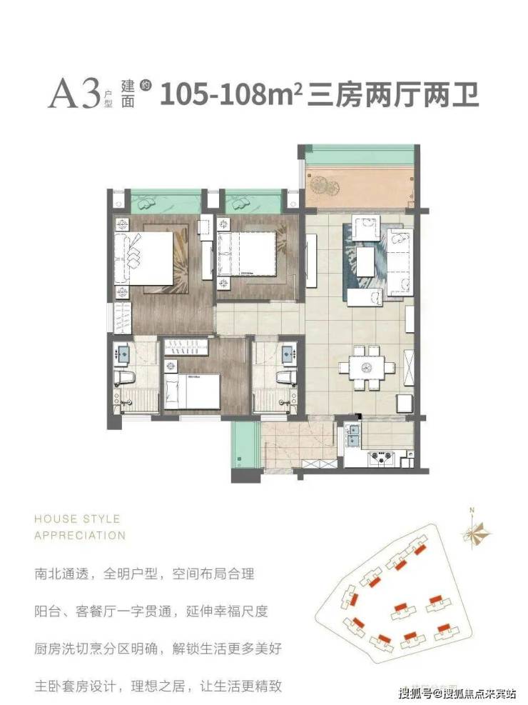 在售户型:103㎡,105㎡三房两厅两卫,128㎡,139㎡四房两厅两卫