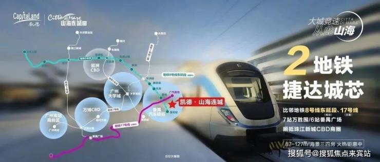 [滨海大盘]百万方国际滨海大城,华南九大金刚● 番禺第一座百万方国际海岸大盘,被喻为华南第九大金刚项目,保利、越秀、碧桂园、奥园等实力房企抢滩入驻,目前已有三个项目收楼入住,预计3-5年后新增入住人口超过10万人,未来将成为高知识人群集聚地。● 1.5公里海岸线,新加坡公园。凯德·山海连城投资约4000万,以新加坡滨海湾公园为蓝本,打造具有新加坡滨海风情的番禺首个滨海公园;项目近海仅约40米,业主可拥有约1.5公里“私属”黄金海岸线。