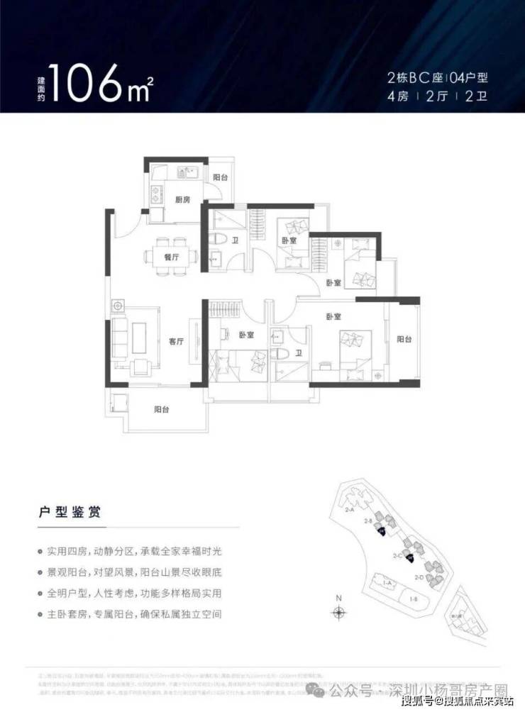 106㎡的4房2厅2卫,设计的竖厅格局,客厅主卧双阳台设计,厨房也带小阳台,三开间朝南,客厅朝西南向,高层可看山景。