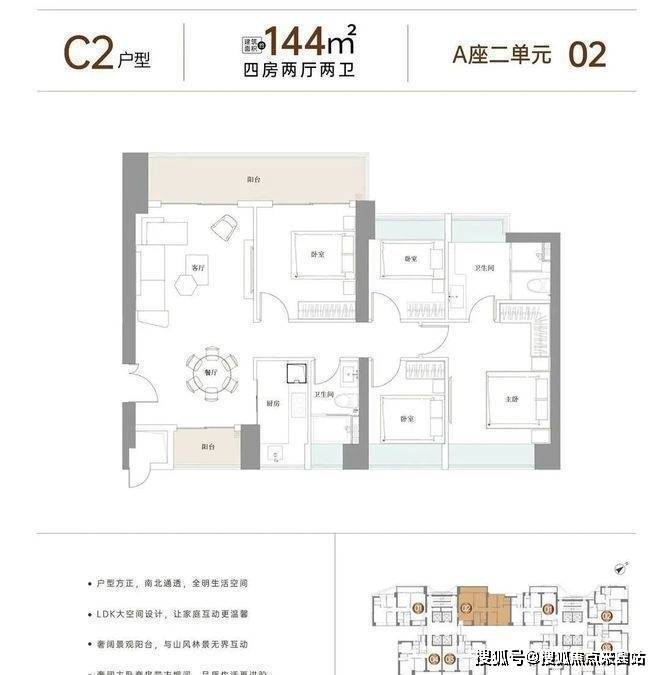 1栋A座二单元四梯四户约125-144㎡3-4房,户型方正·超大观景阳台,近一比一梯户比,层高3.15米,中轴之上,做独享者,悦享尊贵生活体验。