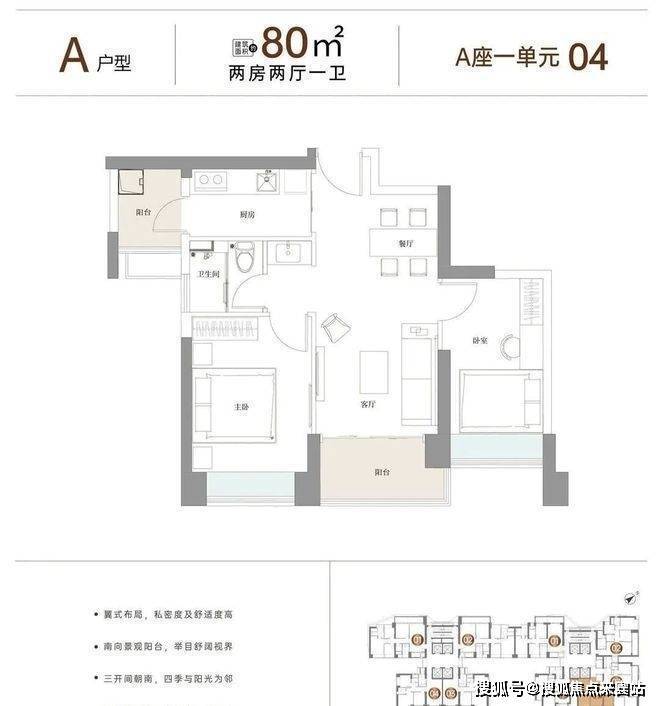 1栋A座一单元四梯五户约80-127㎡2-3房,户型方正·双阳台;