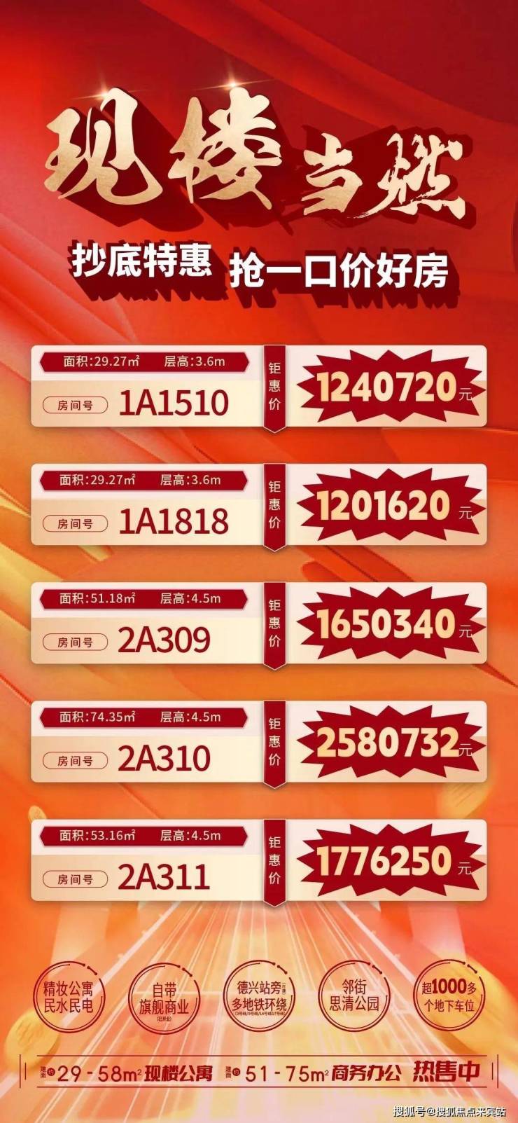 ✅2A座,层高4.5米,建面有约51㎡、53㎡、75㎡三种户型,单价36888元/㎡起、总价约188万元起,交付时间为办完购房手续八个月内。