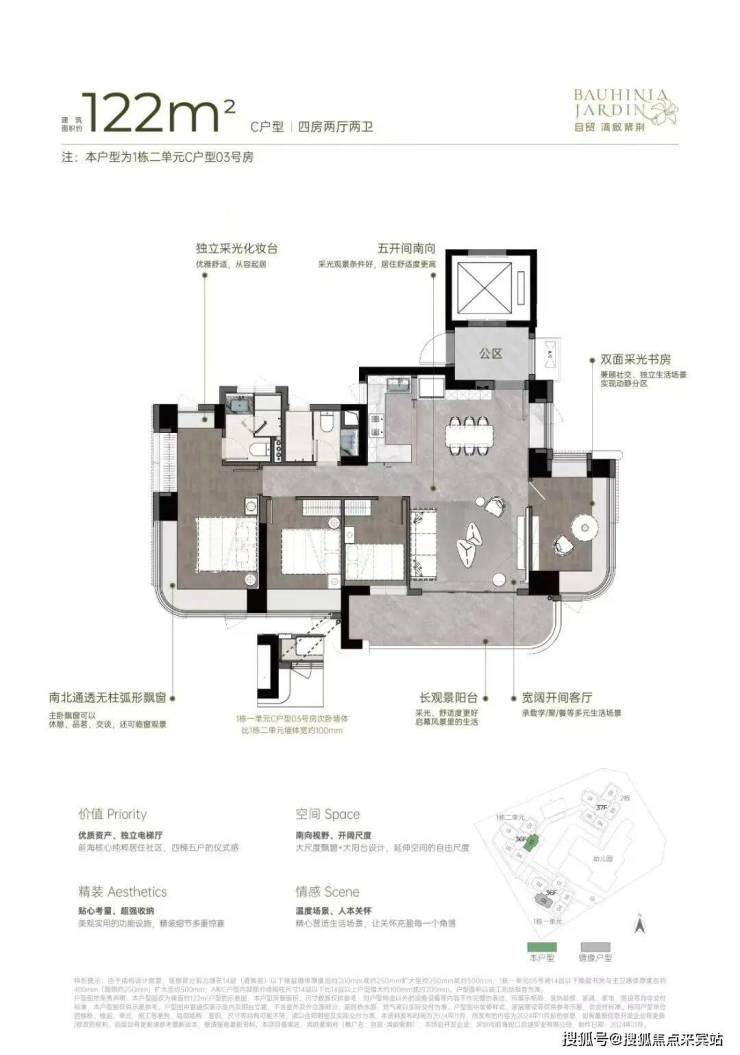 122㎡的4房2厅2卫,设计的是竖厅双龙抱珠格局,专梯入户有独立公区,客厅4.1米开间,LDKB一体化设计,五开间朝南,主卧大套间无柱弧形270°转角飘窗,客厅连接次卧出大阳台,U型厨房,卫生间干湿分离,得房率约92-100%(包含赠送),西南或东南向。