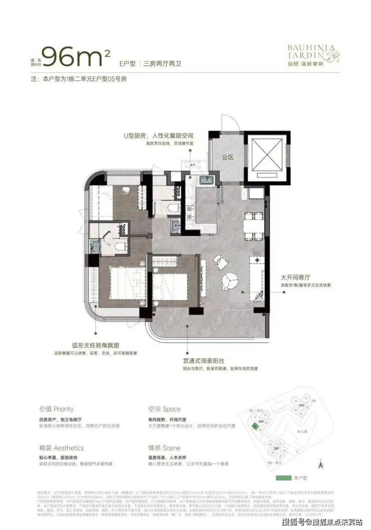 96㎡的3房2厅2卫,仅1栋2单元E户型,设计的是竖厅格局,客厅3.9米开间,LDKB一体化设计,动静分区,三开间朝南,主卧无柱弧形转角飘窗,客厅连接次卧出大阳台,U型厨房,公卫三段式分离,得房率约92-100%(包含赠送),西南朝向。