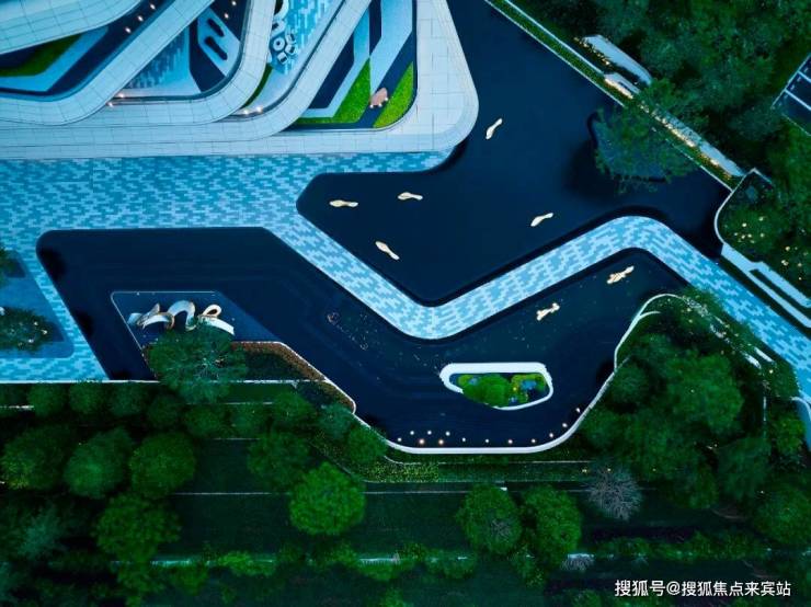 基于项目定位,客群特点及文化提取,我们以《游园赏艺——鱼龙舞》来作为三龙湾1号营销中心的策展主题。辛弃疾在《青玉案》中写道:“东风夜放花千树。更吹落,星如雨。宝马雕车香满路。凤箫声动,玉壶光转,一夜鱼龙舞”,诗中描绘了上元灯节火树银花,灯月交辉,鱼龙漫衍的人间景色。我们提取诗歌中“鱼龙舞”的景象,聚焦大片水景与营销中心主入口对景两个点位,分别以“鱼”及“龙”的抽象造型,营造一场具有文化共鸣的沉浸式游园体验。