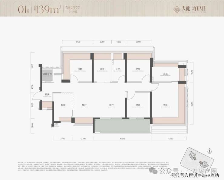 建面约139㎡五房两厅两卫,超大横厅+约6.8米景观大阳台,都是南向采光。景观面很震撼,北向山景,南向海景尽收眼底。一个次卧直通阳台,景观面不输主卧,蔚蓝海面可以躺着看。主卧套房三面采光,市面上是很少见的,开间约4.2米,空间很大,主卫尺度足以放下浴缸。