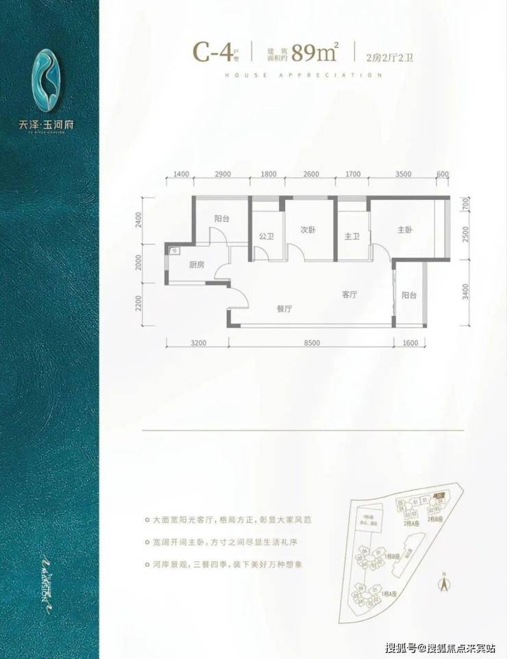 C2户型-89㎡-3房2厅2卫,设计的是竖厅格局,客厅3.5米开间,主卧及客厅阳台都朝南向。