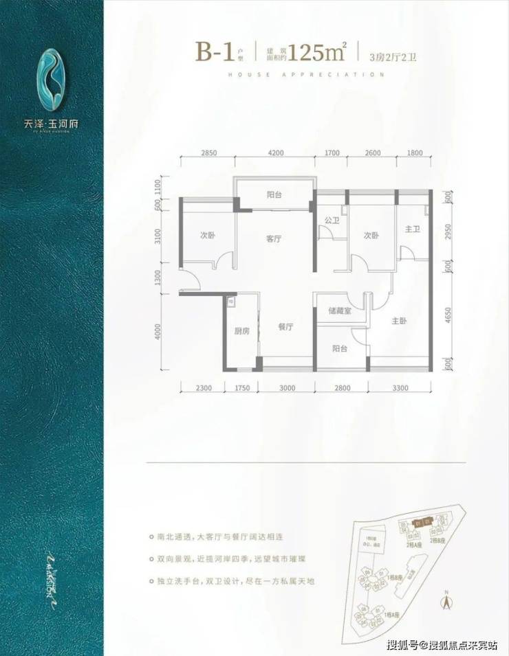 B1户型-125㎡-4房2厅2卫,设计的是竖厅南北通透格局,客厅4.2米开间,阳台主朝北向,全屋飘窗设计。