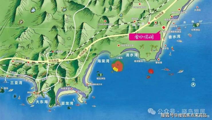 •交通:距离三亚凤凰机场仅85公里,车程一个小时,乘坐环岛高铁仅二十分钟可以达到三亚站,同时项目距离陵水高铁站仅10分钟车程,距离海口市区约182公里,车程约90分钟