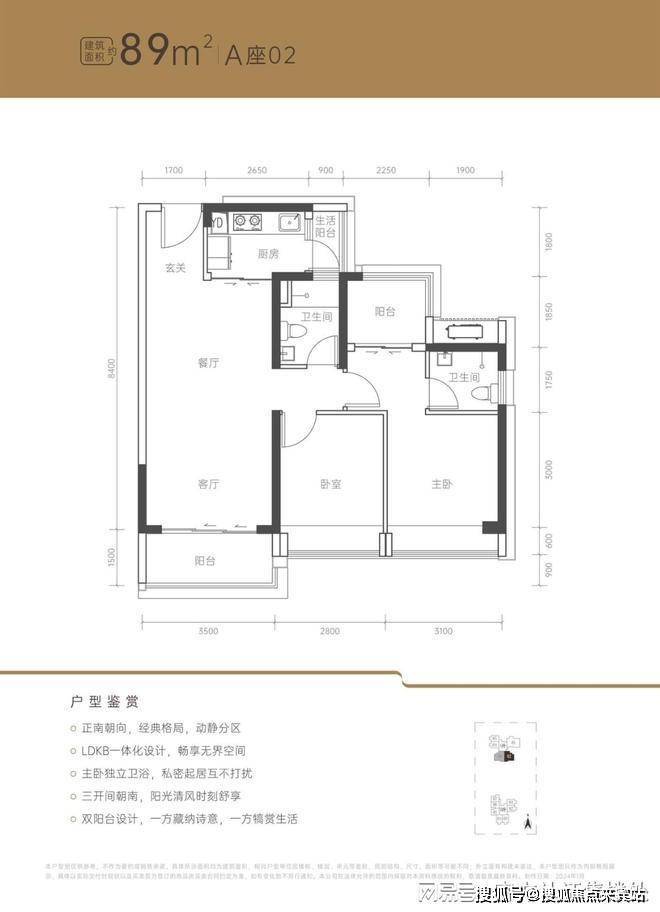 89㎡2+1房2厅1卫:阳台可改卧室,竖厅格局,客厅3.5米开间,客厅及两个卧室均朝南,采光很好,卧室分别做到了3.1米/2.8米的宽度,阳台正南朝向。户型亮点:三开间正南朝向,LDKB一体化设计,动静分区。折后总价589-636万/套,单价6.58-7.08万/㎡。