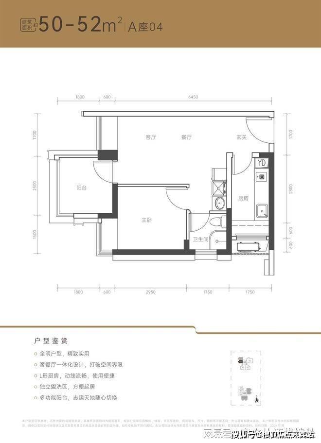 50㎡-52㎡2房2厅1卫:阳台可改成卧室,竖厅格局,客餐厅一体,客厅3米开间,2个卧室分别做到了2.7米/2.5米的宽度,小两房户型,总价低,适合刚需上车客户。户型亮点:全明户型,客厅带飘窗,三分离卫浴,无过道零空间浪费。折后总价309-335万/套,单价6.21-6.73万/㎡。