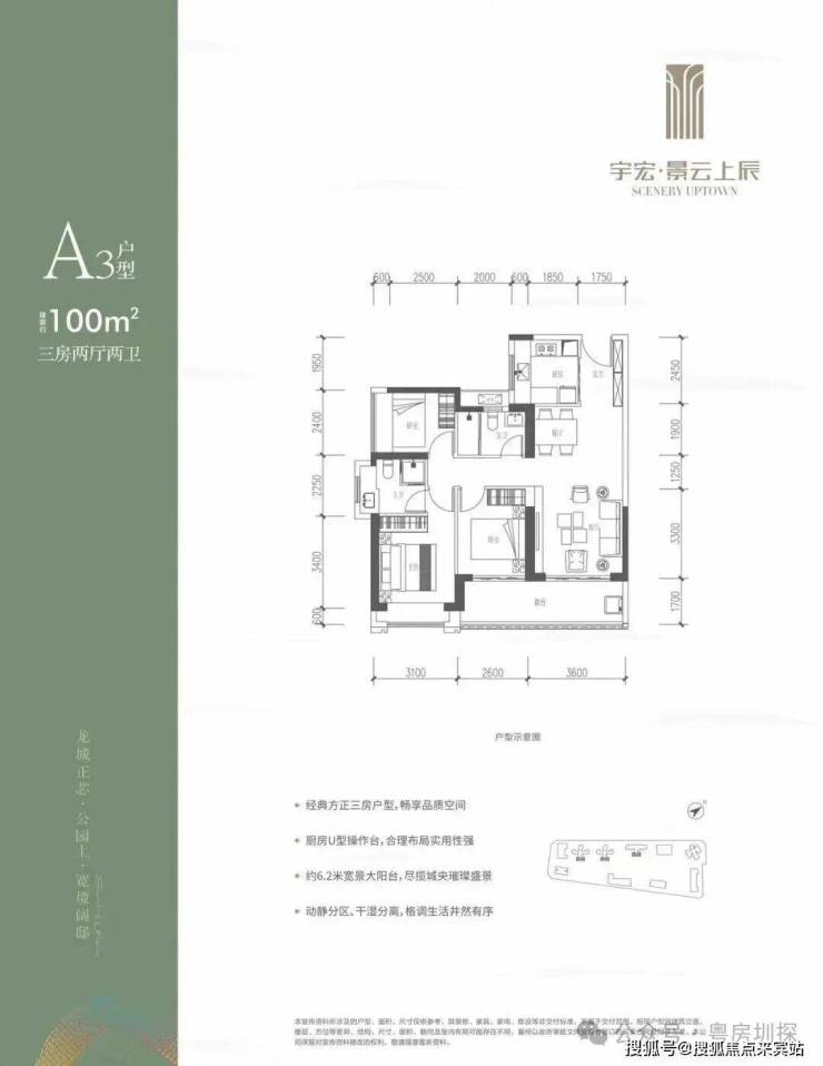 100㎡的3房2厅2卫,设计的是竖厅格局,客厅3.6米开间,LDKB一体化,三开间朝南,3个卧室分别做到了3.1米/2.6米/2.4米的宽度,客厅连接次卧出6.2米长的大阳台,U型厨房,卫生间干湿分离,得房率约76%(不含赠送),东南朝向。