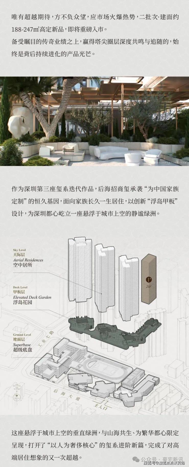承迹景观在后海招商玺的景观设计中,创新采用“浮岛甲板”立体空间规划,借鉴香港、新加坡的垂直复合开发智慧,构建起“超级底盘 + 悬浮花园”的独特格局,重新定义了豪宅生活的边界与丰盈。