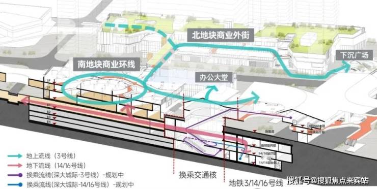 这里汇聚了3号线、14号线、16号线以及正在建设中的深大城际,形成了一个四线交汇的交通枢纽。