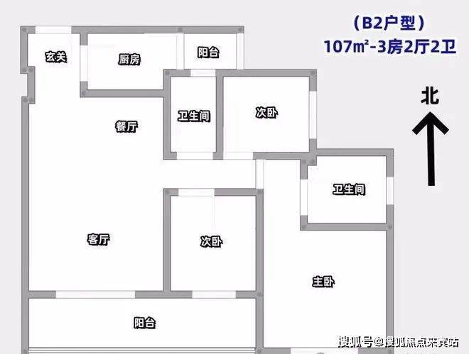 107㎡的3房2厅2卫(B2户型,1栋4单元03/04户型)设计的是经典竖厅格局,进门独立玄关,客厅3.5米开间,LDKB一体化设计,动静分区,3个卧室分别做到了3.15米/2.85米/2.65米的宽度,客厅连接次卧出6.35米长的大阳台,二字型厨房还带1个小生活阳台,得房率75-77%(不含赠送),阳台有朝西向、朝东向或朝南向。