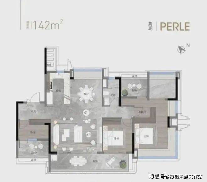 由于是新规后的产品,得房率很高。南向超大面宽,南北双阳台,主卧270度飘窗,尺度惊人,居住舒适度拉满。